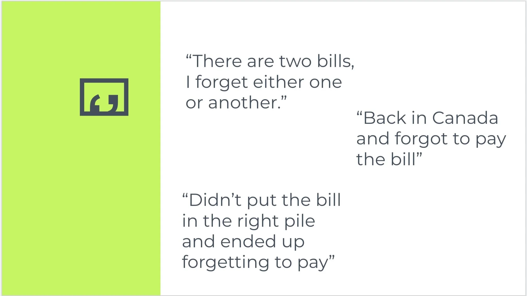 Finally, the customers we spoke to gave rich detail to our research efforts. We identified some novel challenges to getting bills paid from various customers. For example, one recounted having their water shut off twice. She couldn't remember her account number, which made it impossible to make payments online. Also she had two water bills to pay, each from different entities and couldn't keep them straight. She decided it was better to visit the payment office anytime she was nearby, just to check if she had a bill to pay. The lack of transparency was clearly a serious impediment.